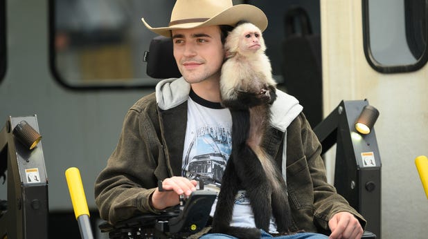 Pendant une bonne partie de son temps de fonctionnement, Gigi et Nate livre au moins ce qu’il promet: un jeune homme et son singe – pour être plus précis, un jeune homme nouvellement tétraplégique et son singe de service. Quand il ne s’agit que de la star Charlie Rowe, ni paralysée ni américaine mais convaincante pour jouer les deux, interagir avec Allie le singe (et des doubles numériques occasionnels), nous obtenons un portrait convaincant de la façon dont ces capucins entraînables interagissent avec des humains qui peuvent à peine bouger. Ou du moins qui prétendent pouvoir à peine bouger ; Rowe a pris soin de ne jamais se présenter comme valide devant Allie, pour s’assurer qu’elle croirait qu’il avait besoin d’aide.