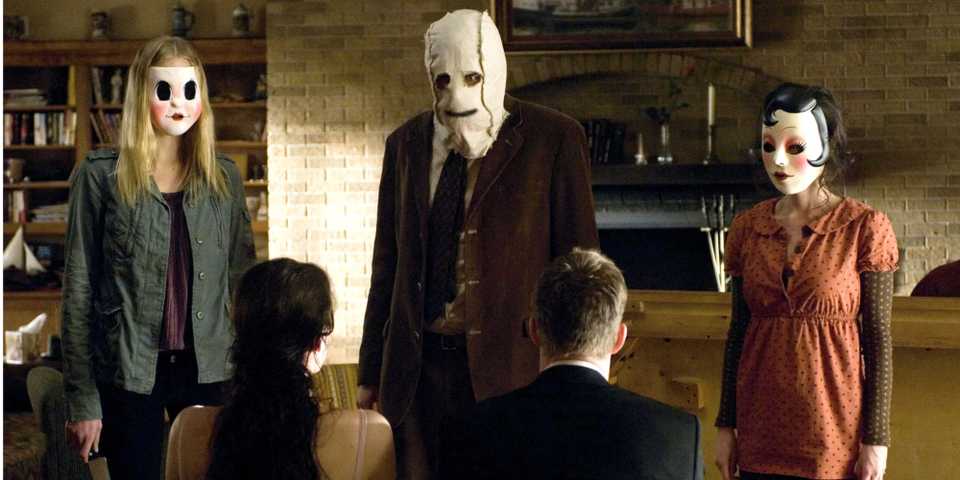 Le trio infiltre ensuite les maisons des couples, le premier film étant une maison d’été isolée en Caroline du Sud et la suite se déroulant dans un parc à roulottes isolé de l’Ohio. Les habitants de chaque demeure sont ensuite traqués et assassinés par des assaillants masqués qui, lorsqu’on leur a demandé pourquoi ils faisaient cela, ont répondu par la phrase emblématique effrayante : « Parce que vous étiez chez vous ». Sans autre explication sur les histoires ou les motivations, le public a été choqué par un examen aussi sombre, mais réaliste, de la violence aléatoire perpétrée par Les étrangers.